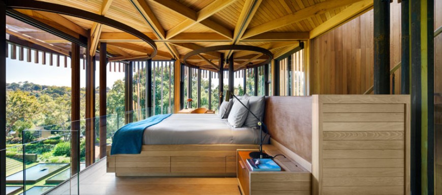 Upstairs in the bedroom, a glass safety railing has been added in front of the bed to provide an unobstructed view of the trees.