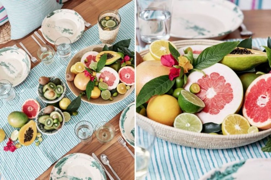 Call out on what the tropics have that it’s best to offer and channel all its scents, colors and atmosphere with a dining setting filled with baskets of freshly cut fruit, scented water, and lots of color. Use linens and dinnerware that add a graphic punch to an already festive gathering, and opt for natural baskets, ceramics and anything with a hand-done touch to embrace the warm, island feel.
